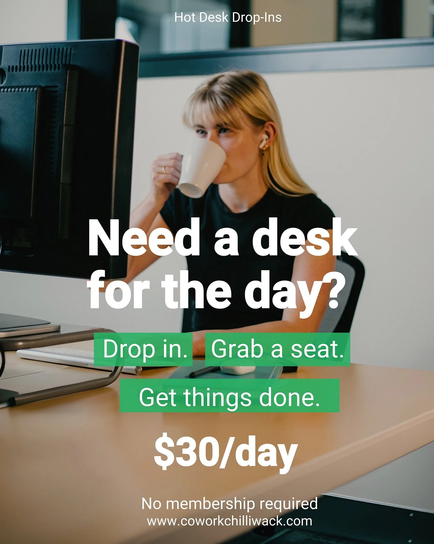 Cowork Chilliwack is a professional and inviting coworking space located near downtown Chilliwack. We provide flexible desk, office and meeting room rentals in a spacious workspace designed to accommodate a variety of startups, entrepreneurs and creatives.